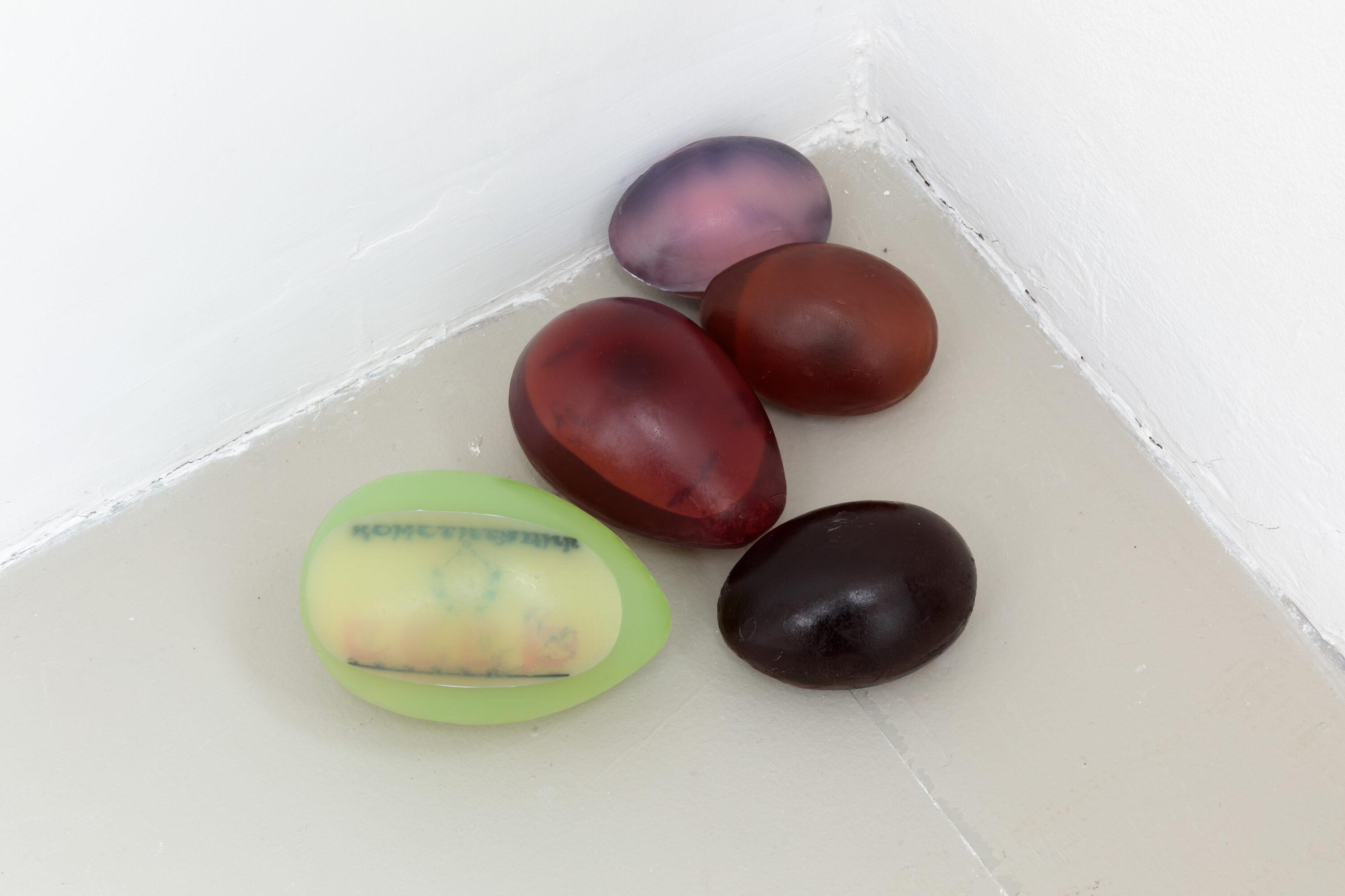 Installationsansicht / Installation view: „Asking for a Friend“ („Eiertanz (eintausendjähriger)“, 2024, Seifenglycerin, Drucke antisemitischer Karikaturen, Maße variabel, Achinoam Alon), Kunstverein Nürnberg, 2024