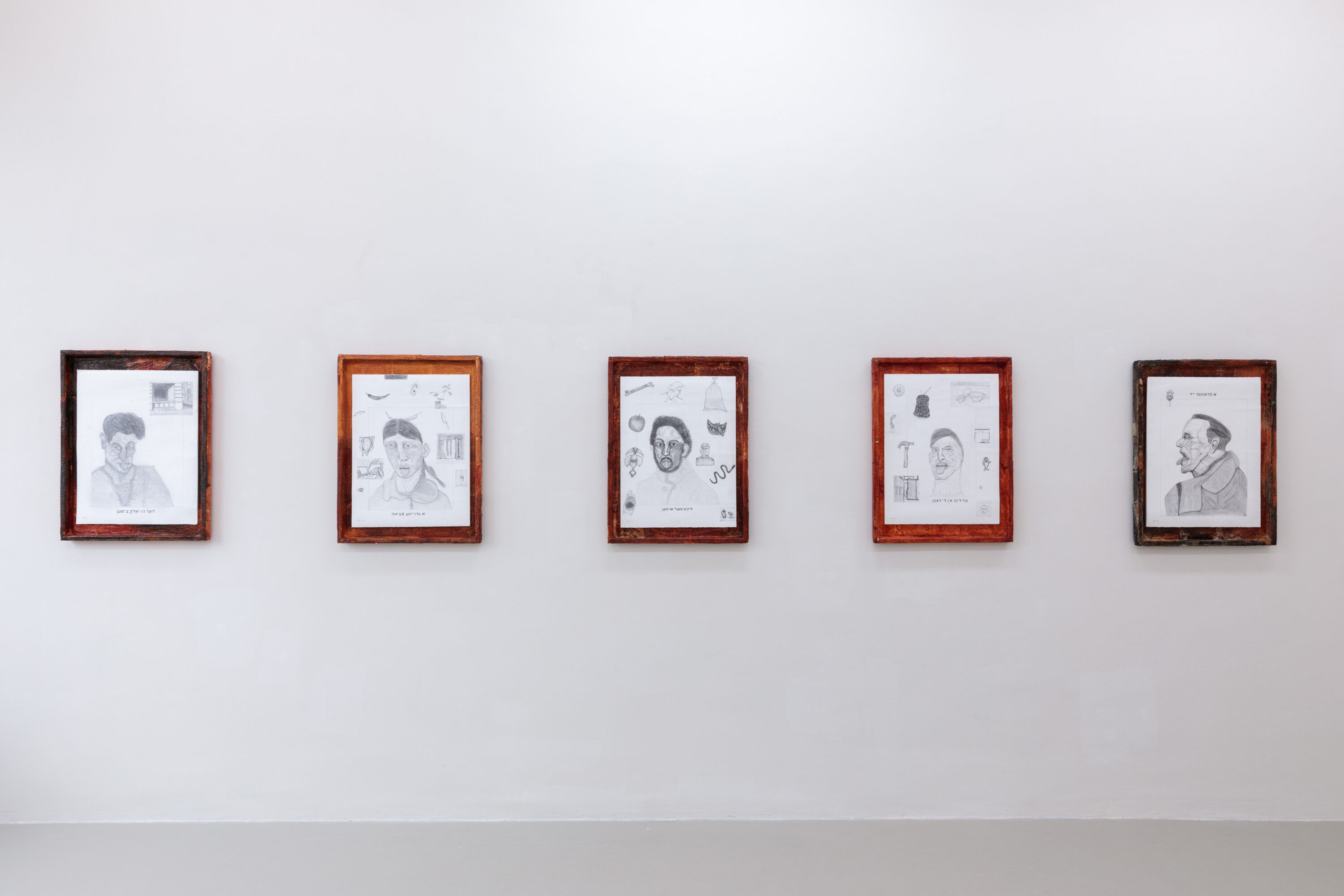 Installationsansicht / Installation view: „Asking for a Friend“, („#3 Bad Breath (The New York Times)“, 2020-22, Bleistift und Graphit auf Papier im Künstler*innenrahmen, 80 x 60 x 4 cm, I. S. Kalter / „#8 Bad Breath (Great Bargain)“, 2020-22, Bleistift und Graphit auf Papier im Künstler*innenrahmen, 80 x 60 x 4 cm, I. S. Kalter / „#6 Bad Breath (Bright Eyes)“, 2020-22, Bleistift und Graphit auf Papier im Künstler*innenrahmen, 80 x 60 x 4 cm, I. S. Kalter / „#2 Bad Breath (Bleeding In The Rain)“, 2020-22, Bleistift und Graphit auf Papier im Künstler:innenrahmen, 80 x 60 x 4 cm, I. S. Kalter / „#5 Bad Breath (Straightforward Jew)“, 2020-22, Bleistift und Graphit auf Papier im Künstler:innenrahmen, 80 x 60 x 4 cm, I. S. Kalter), Kunstverein Nürnberg, 2024