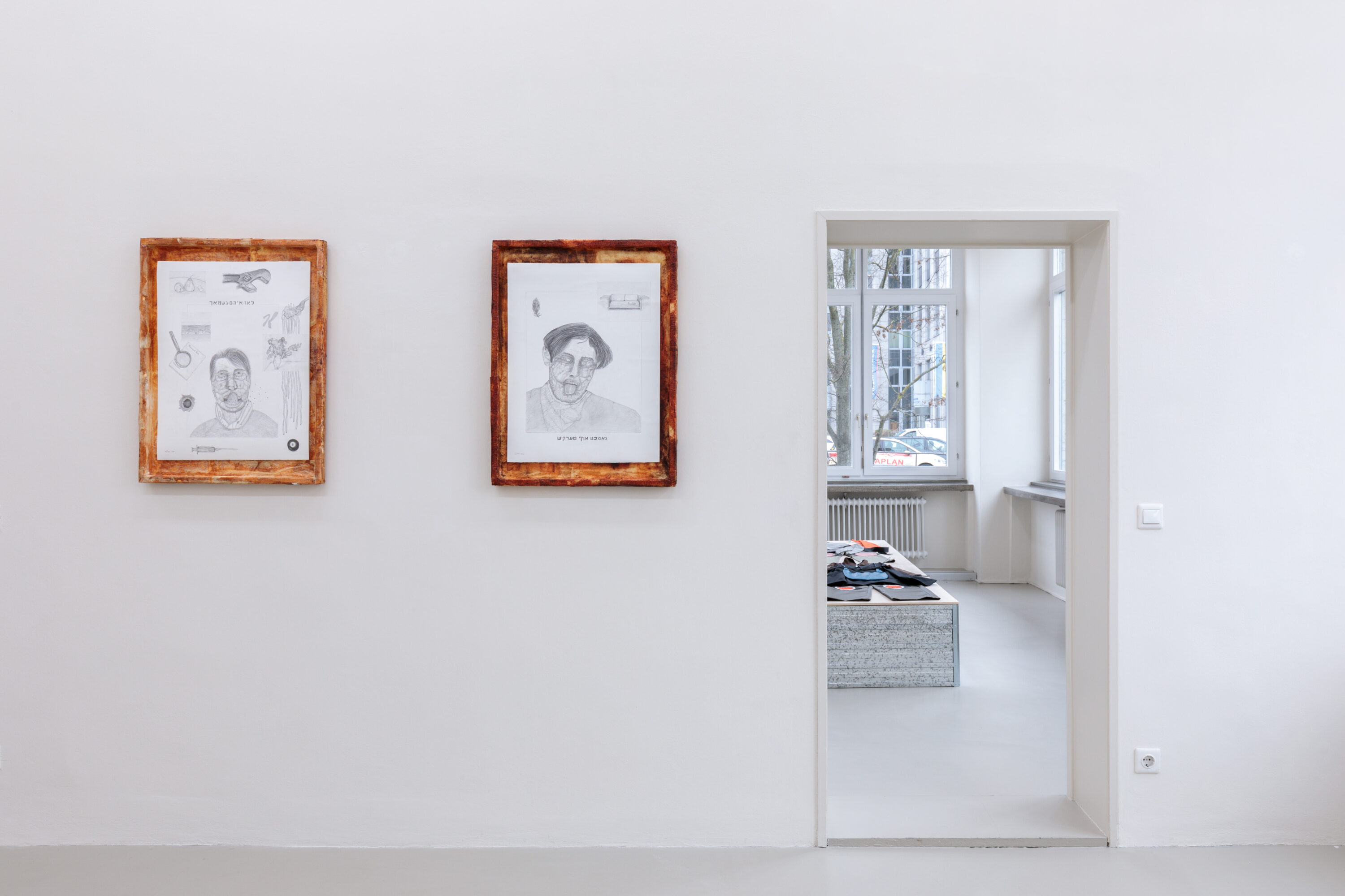 Installationsansicht / Installation view: „Asking for a Friend“, („#1 Bad Breath (Live Him Alone)“, 2020-22, Bleistift und Graphit auf Papier im Künstler:innenrahmen, 80 x 60 x 4 cm, I. S. Kalter / „#7 Bad Breath (Made In Turkey)“, 2020-22, Bleistift und Graphit auf Papier im Künstler:innenrahmen, 80 x 60 x 4 cm, I. S. Kalter), Kunstverein Nürnberg, 2024
