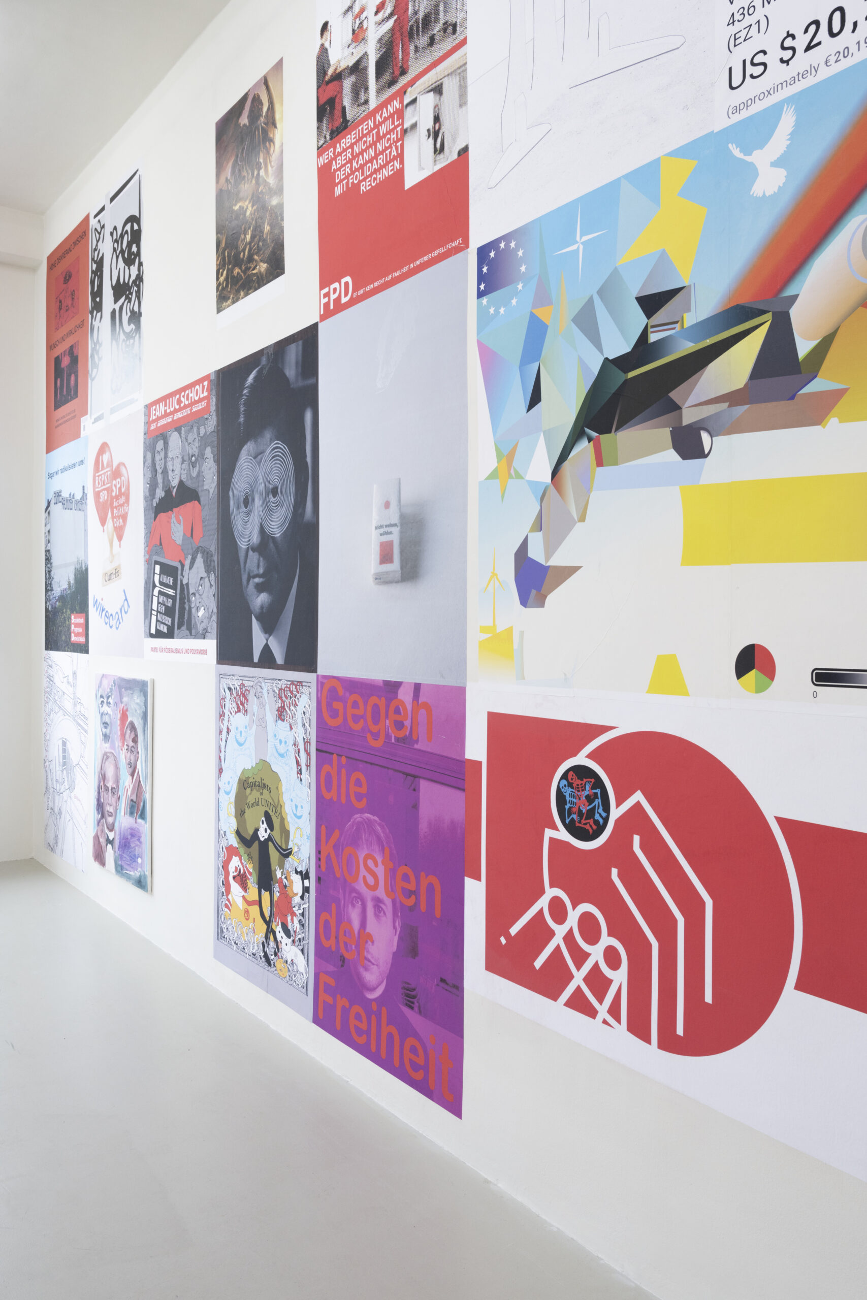 Nach wie vor lernen wir – Kuratoren, Teilnehmende und ihr Publikum –, was diese Schau in ihrer durchs „Medium Poster“ formatierten künstlerischen Vielstimmigkeit sein könnte: eine thematische und/oder spekulative Ausstellung; ein längst überflüssig gewordener oder dringend neu zu startender Diskurs über die „Sozialdemokratie“; ein Politikberatungsseminar von und für Künstlerinnen und Künstler, die sich im Zeitalter einer gesellschaftsrelevant „vernutzten“ Kunst selbst oft lieber als Radikale denn als Realisten präsentieren. Die Schau könnte die Outlines einer Utopie skizzieren, die immer noch nach dem geeigneten Ort ihrer Verwirklichung sucht und basiert zugleich auf realer und/oder ideeller Selbstausbeutung; sie ist ein Kunstkurs für Genoss*innen und solche, die es werden wollen; ein Marketing Stunt für ein nicht vorhandenes Produkt, dessen parteiliche Form zurzeit immerhin an den Regierungshebeln sitzt; ein Ausfallschritt ins notorisch komplizierte Verhältnis von Politik und Kunst oder schlicht eine von Rottönen dominierte Postergalerie…