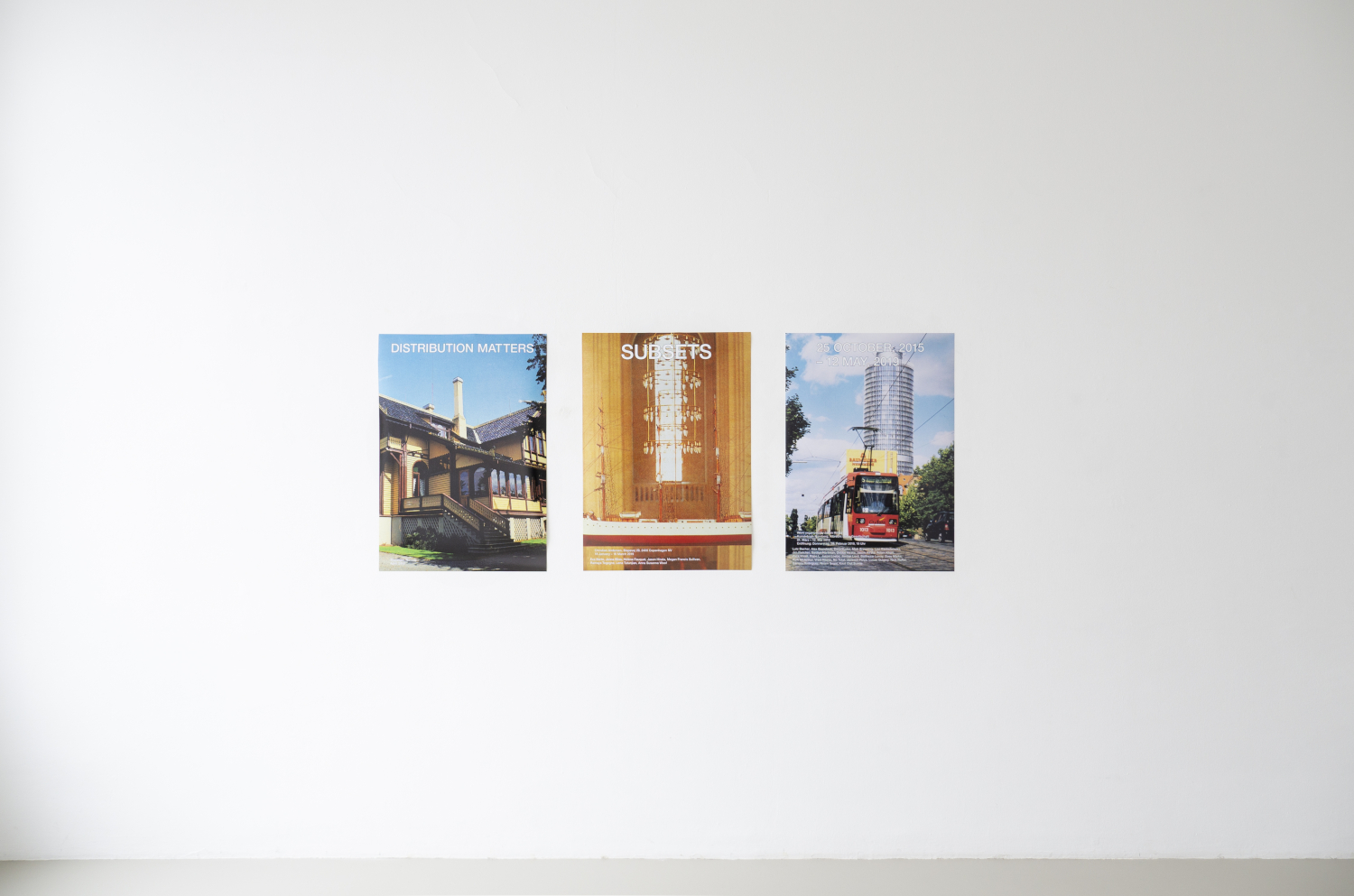 Ausstellungsansicht / Installation view Lucas Quigley, Levi Easterbrooks, Jason Hirata, Posters, 2019 – ongoing, digital inkjet prints, installation view, 25 OCTOBER, 2015 — 12 MAY, 2019, Work organized by Jason Hirata, Kunstverein Nürnberg, 2019
