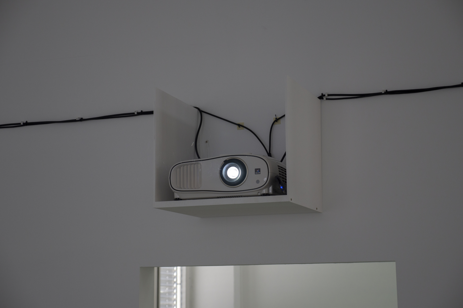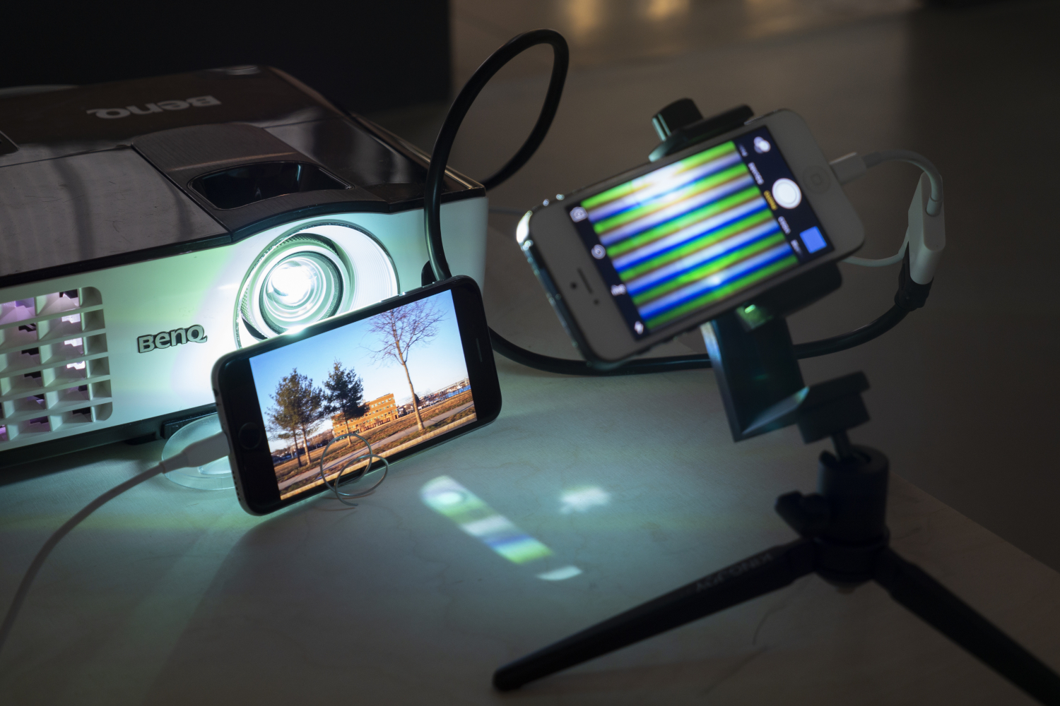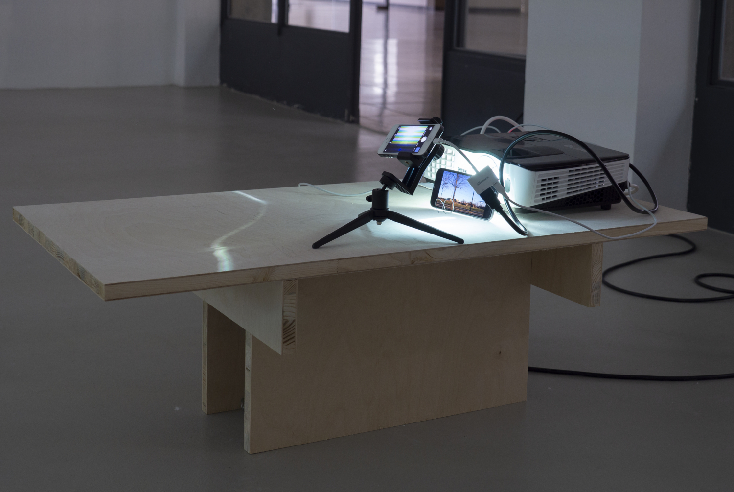 Ausstellungsansicht / Installation view Jason Loebs, Syncopes, 2005, 2017, Fort Trumbull, New London, CT, Infocus Projector, iPhone 5 / USB charger, Samsung S4 / USB charger, Manfrotto iPhone mount / stand, Lightning Digital AV Adapter, HDMI cable, custom USB outlet, birch wood, 18 x 20 x 31 in, projection variable, 25 OCTOBER, 2015 — 12 MAY, 2019, Work organized by Jason Hirata, Kunstverein Nürnberg, 2019. Courtesy the artist and ESSEX STREET, New York.