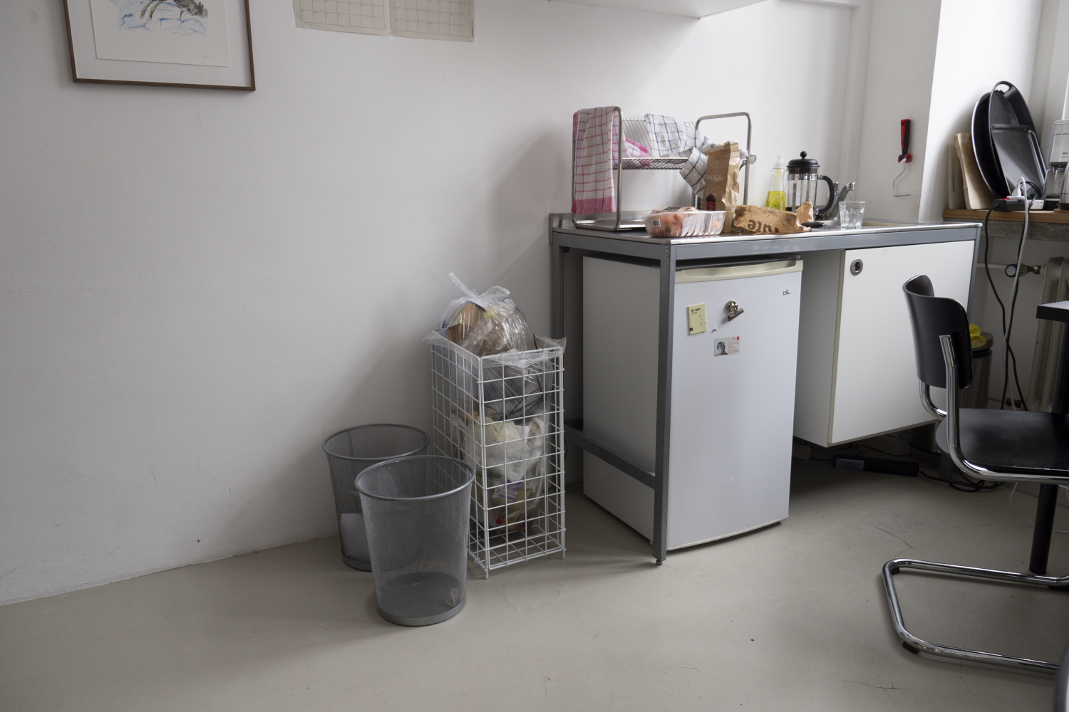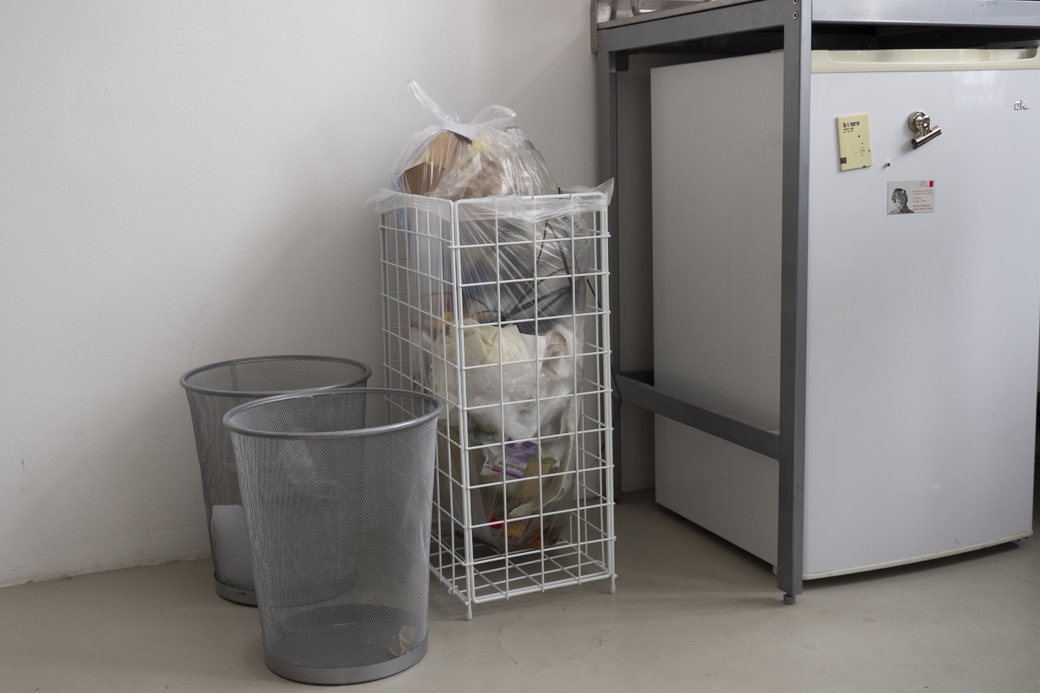 Ausstellungsansicht / Installation view Alex Bienstock, Jason Hirata chooses an aesthetically pleasing trashcan for an exhibition and lets it be functional, 2019, Fripa waste basket No. 2340013, daily gallery waste, Kunstverein Nürnberg, 25 OCTOBER, 2015 — 12 MAY, 2019, Work organized by Jason Hirata, Kunstverein Nürnberg, 2019. Courtesy the artist.